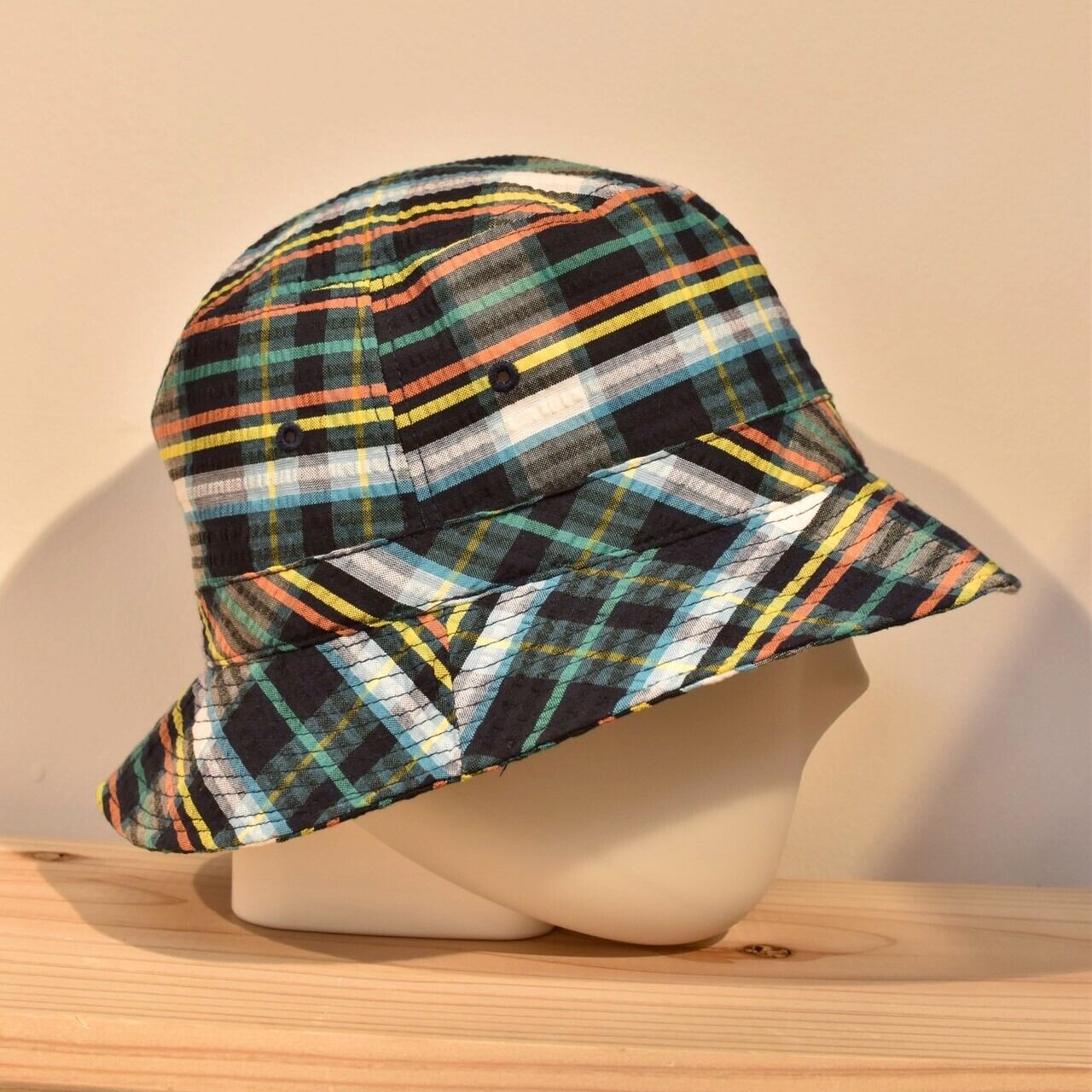 シアサッカー生地を採用した紐付きチェックバケットハット