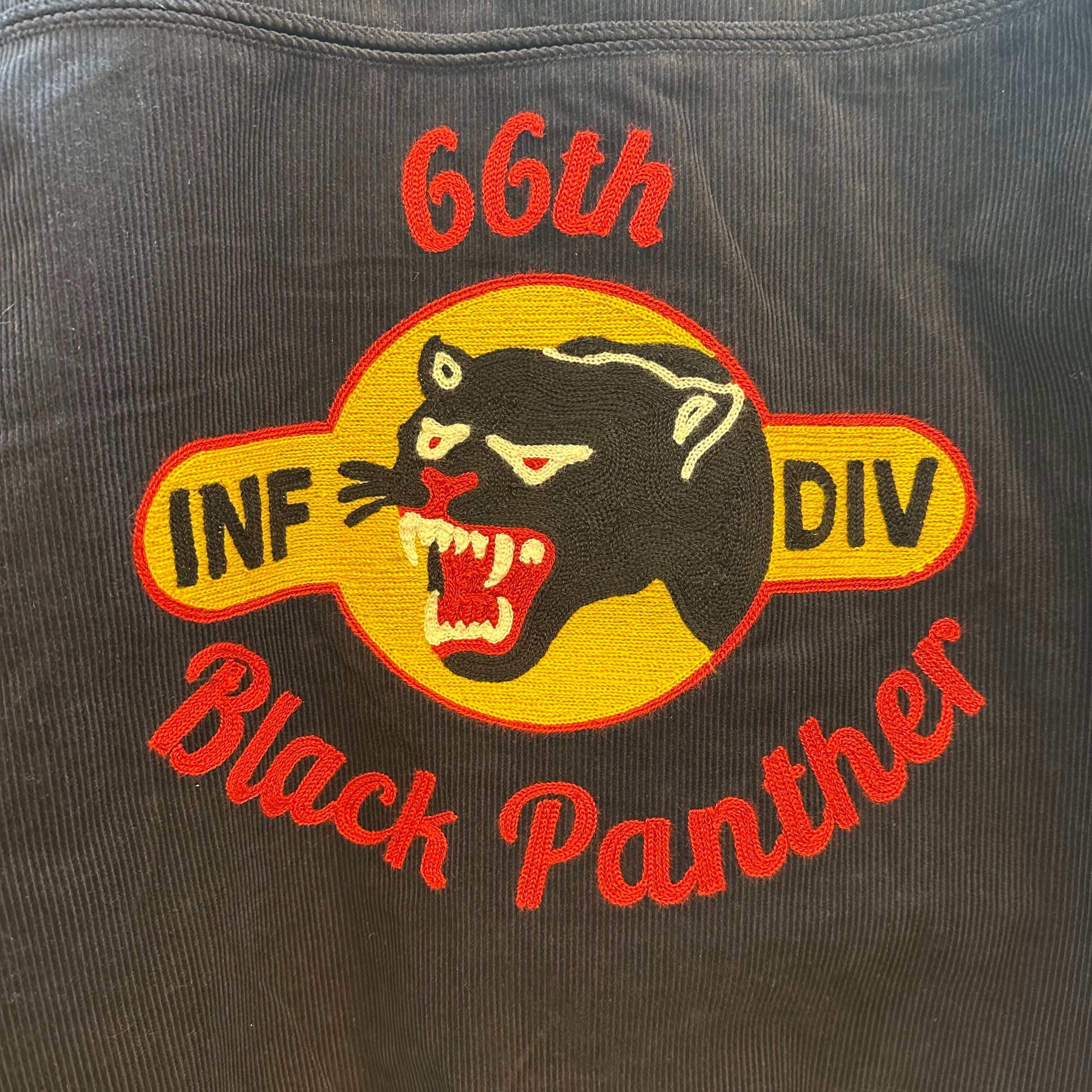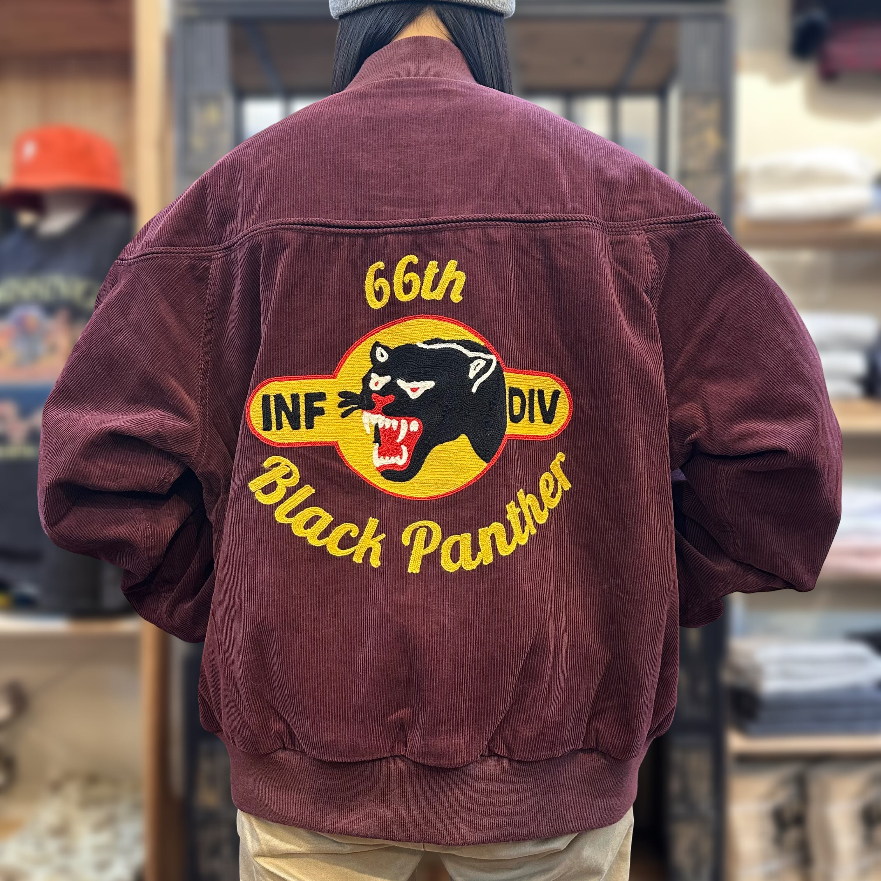 ◼︎12ウェールの細畝コーデュロイを使用した刺繍ダービージャケット。装飾には、40年代に実在したアメリカ陸軍第66歩兵師団(ブラックパンサー師団)のパッチをモチーフにしている。肌触りの良い裏地を使用しているので、着脱が容易に行えます。